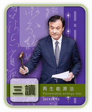 2019/4/12 立院三讀《再生能源發展條例》從此以後全民皆可成立「再生能源公民電廠」且規定政府機構、公營事業新建、增建、改建公共工程且條件允許的情況下優先裝置再生能源。