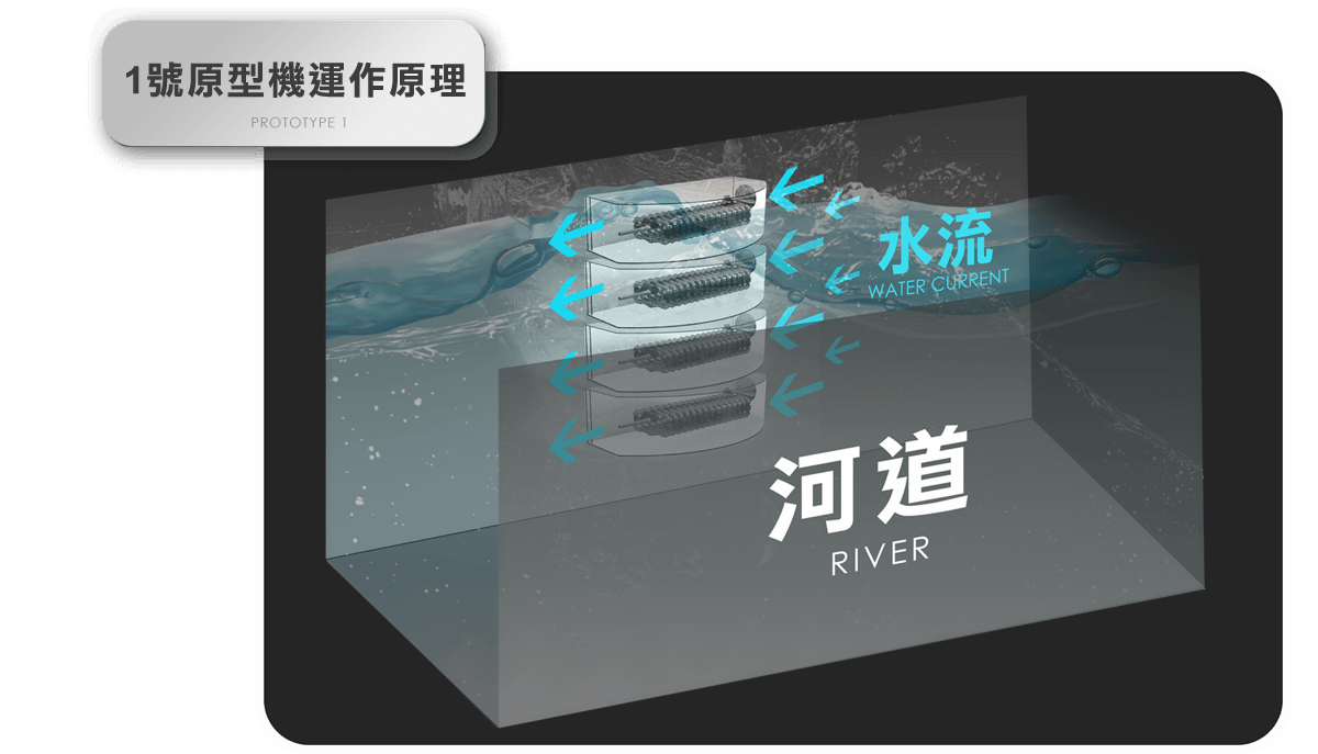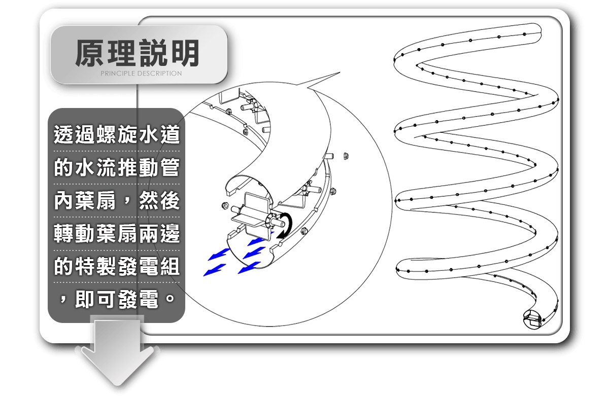 透過螺旋水道的水流推動管內葉扇,然後轉動葉扇兩邊的特製發電組,即可發電。