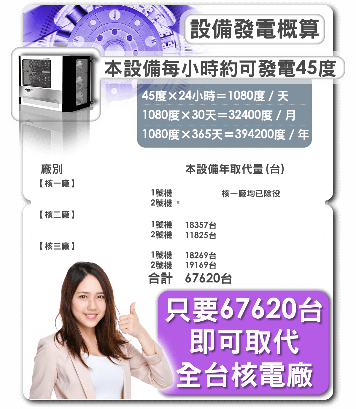 只要67620台即可取代全台核電廠